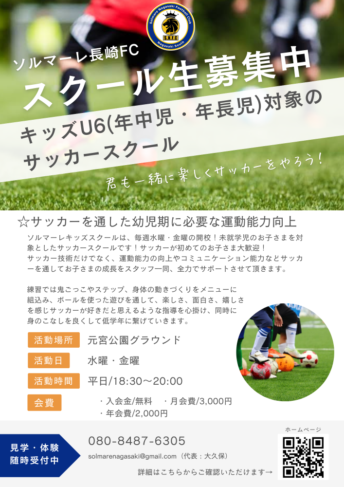 ソルマーレキッズ・サッカースクールは、毎週水曜日と金曜日の開校!幼児(年中・年長)のお子さまを対象としたスクールです!サッカーがはじめてのお子さま、未経験のお子さま大歓迎!サッカー技術だけでなく、運動能力の向上やコミュニケーション能力など、サッカーを通じてお子さまの成長をコーチ一同、全力でサポートをさせていただきます!